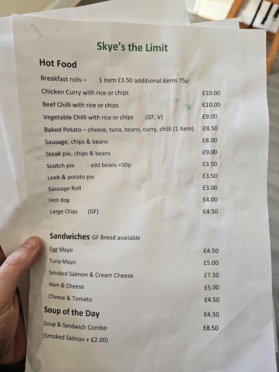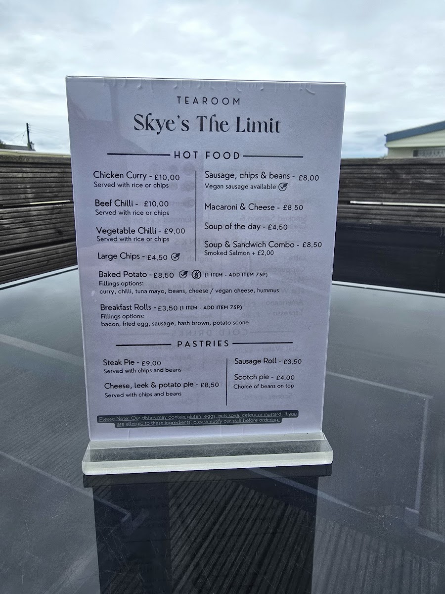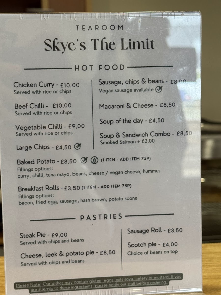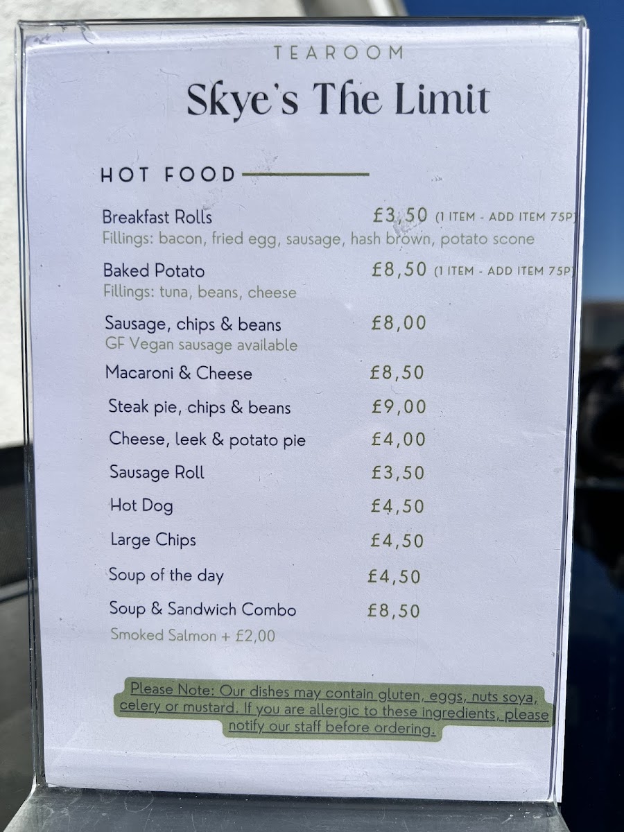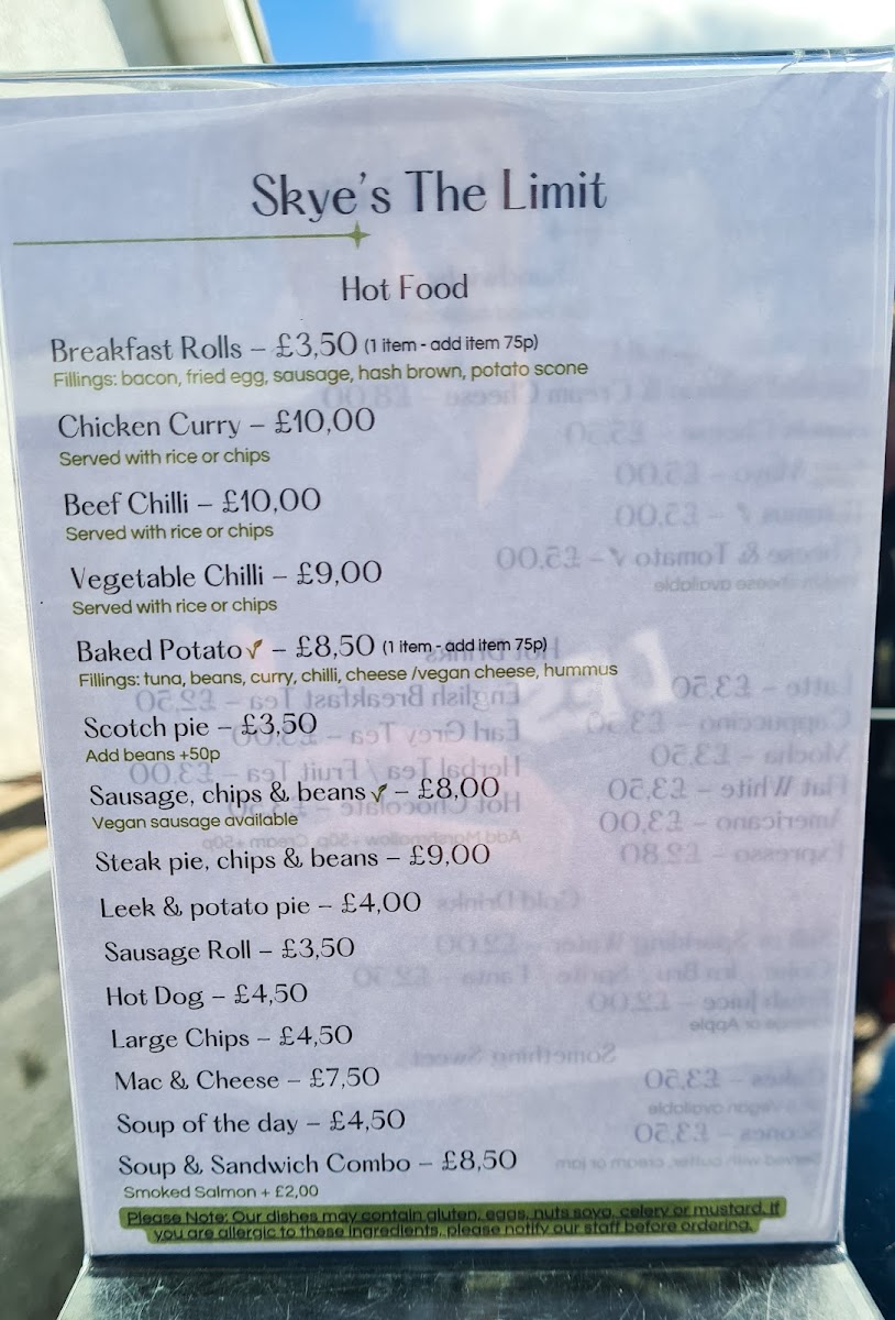 Hot Food options consist of dishes like chicken curry, beef and vegetable chilli served with a choice of rice or chips, as well as baked potatoes, sausage with chips and beans, steak and leek & potato pies, sausage rolls, hot dogs, and large portions of chips. These items offer heartier meal choices suitable for lunch or dinner.