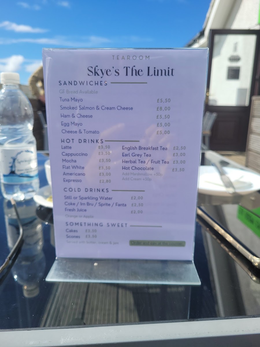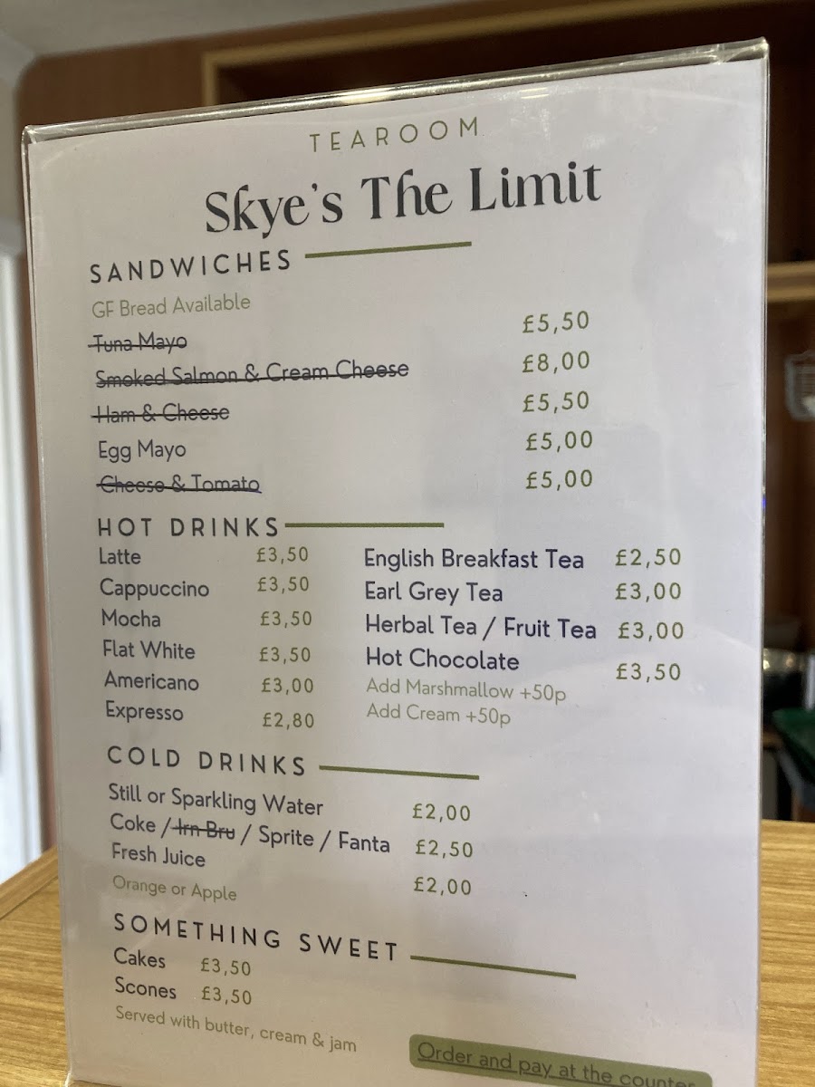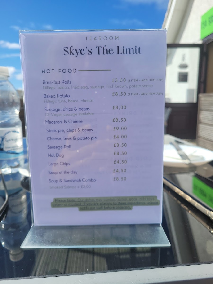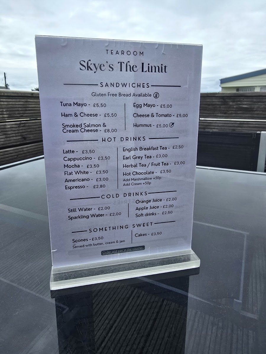 Hot Food options consist of dishes like chicken curry, beef and vegetable chilli served with a choice of rice or chips, as well as baked potatoes, sausage with chips and beans, steak and leek & potato pies, sausage rolls, hot dogs, and large portions of chips. These items offer heartier meal choices suitable for lunch or dinner.